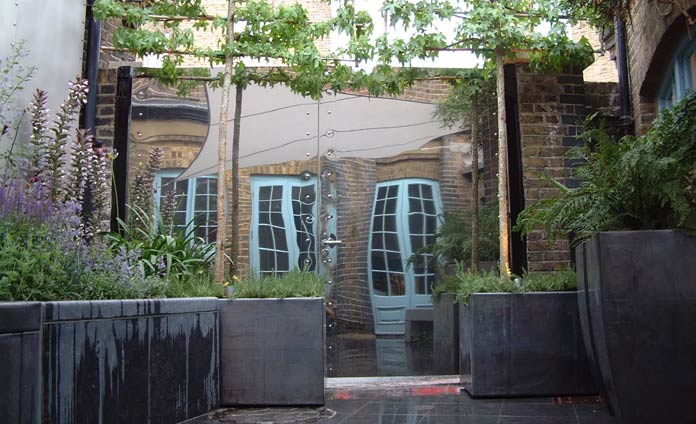 A claustrophobic cluttered courtyard was transformed into an airy outdoor space for socialising. Strong simple lines to the design softened by plants. Belgian blue stone, sandblasted steel with zinc and lead detailing Fibre optc detailing to spout and water bowl, the light pours into the bowl for a magical effect.